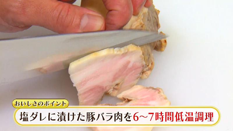 バラ肉を塩ダレに一晩漬けて、6〜7時間かけて低温調理しています。ある程度火が通って、うま味を逃がさない温度を研究しました