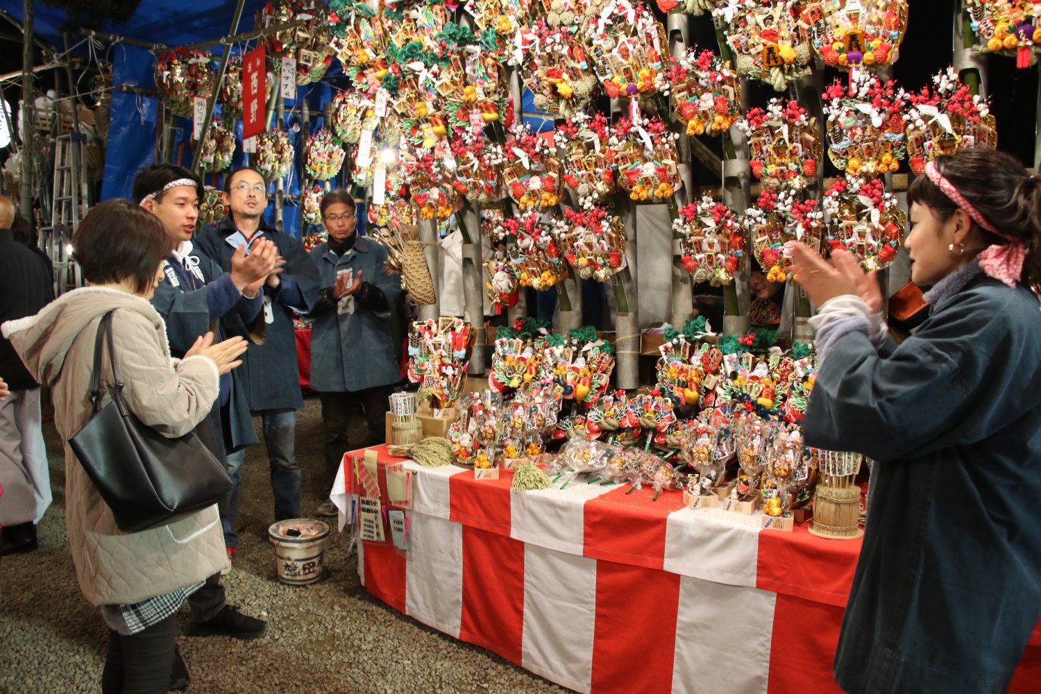 熊手市は東京都内では“酉の市”として11月の酉の日に各所で行われるが、埼玉県内では12月に開催される。「12月3日の秩父神社に始まり、6日は行田の愛宕神社、10日は大宮の氷川神社、12日は浦和の調(つき)神社、15日は川口のおかめ市、17日は蕨の和樂備(わらび)神社と南下していくのが特徴です」と大月さん。境内に並ぶ熊手はひとつひとつ形や飾りが異なるので、見て回るだけでも楽しい。商談成立の暁には、熊手商による威勢のいい掛け声と手締めがあちこちで鳴り響き、周囲は活気にあふれる。