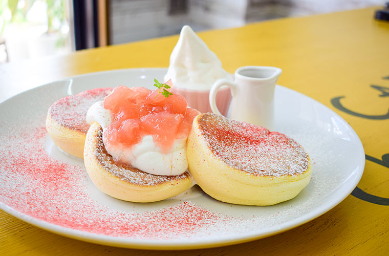注文を受けてから丁寧に焼き上げるパンケーキは、シュワシュワでももちもちでもなく、しっとりとなめらか。ひと口食べれば、優しい甘さと香ばしい風味が口いっぱいに広がります。