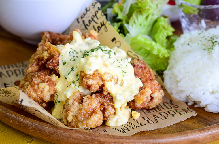 一番人気は『選べるとり唐プレート』。メインはチキン南蛮、油淋鶏、レモン漬けの3種類から選べ、この日はチキン南蛮をチョイス。カリッと揚げた唐揚げを甘酸っぱい南蛮ダレにくぐらせ、自家製タルタルソースをたっぷりかけた一品です。しっかり下味の付いた唐揚げに、ほんのり酸味が利いたタルタルが絡み、ご飯が止まらないおいしさ!