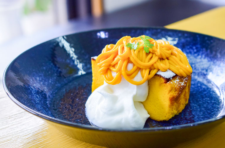 季節限定の『バスクチーズケーキ』は、完熟カボチャを練り込んだ濃厚な味わい。素材本来の甘さと香ばしい焼き目のコントラストが絶妙で、上にはカボチャのモンブランがトッピングされた贅沢な一皿です。