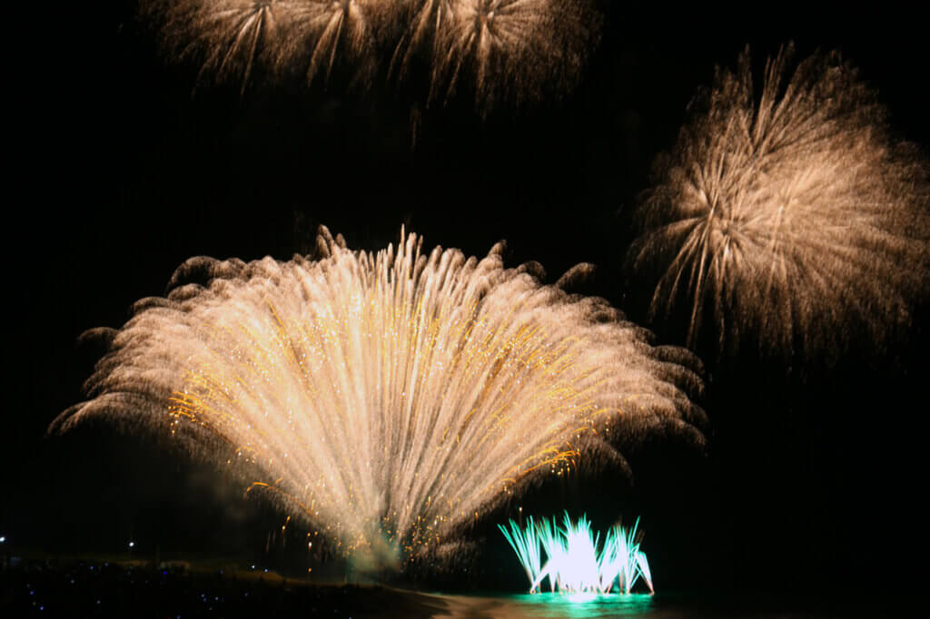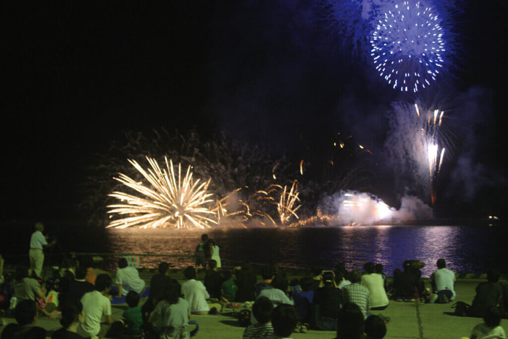 海に向けて打ち上げる花火は、間近から見る迫力と海面に映える美しさが魅力。クライマックスのミュージックスターマインは必見です。