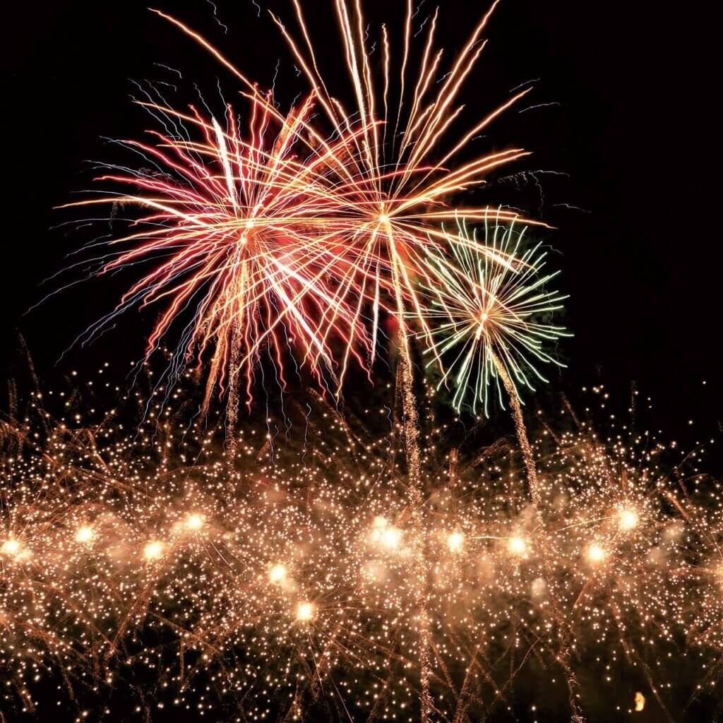 伝統芸能と音楽花火が織り成す、風情ある光景を堪能できる花火大会。さまざまな曲とコラボレーションしながら、大輪の花火が佐渡の夜空を染めます。