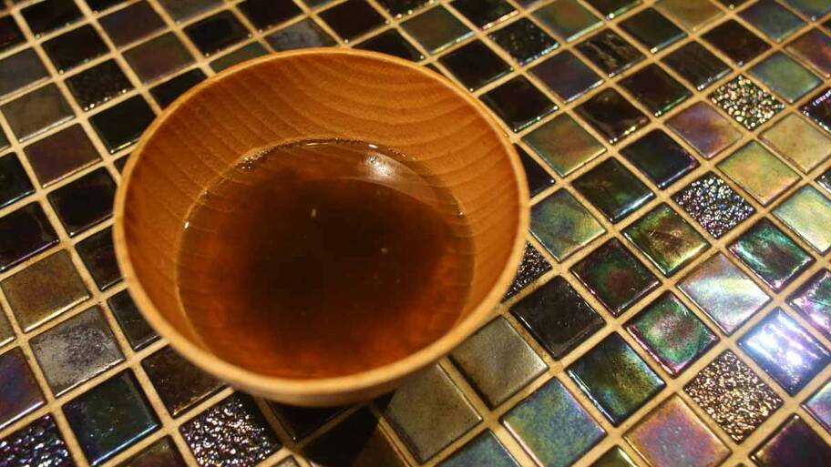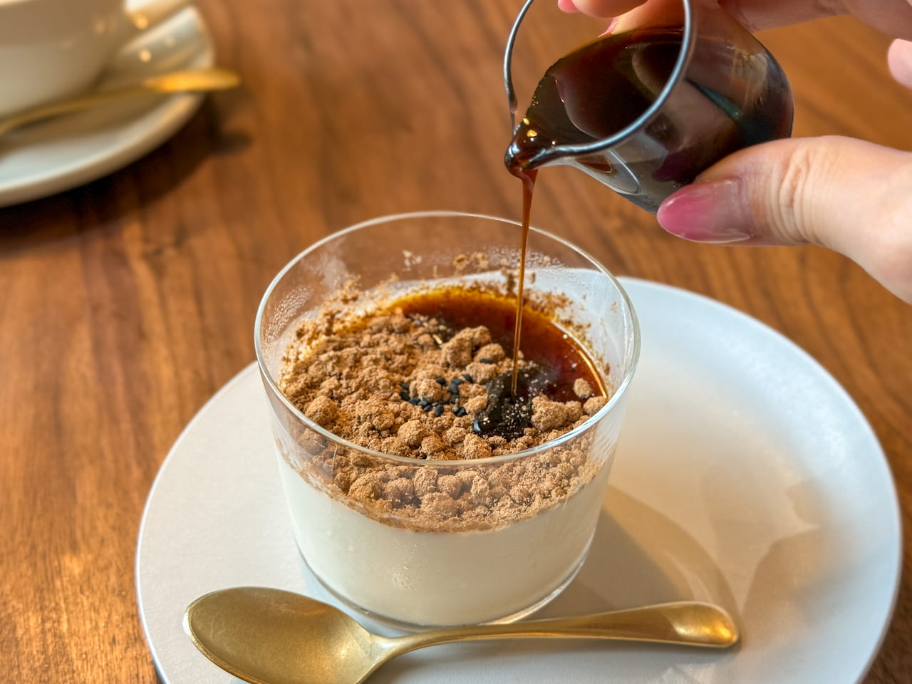 きな粉と黒胡麻がアクセントの豆乳プリンは、特製の黒蜜をかけていただきます。