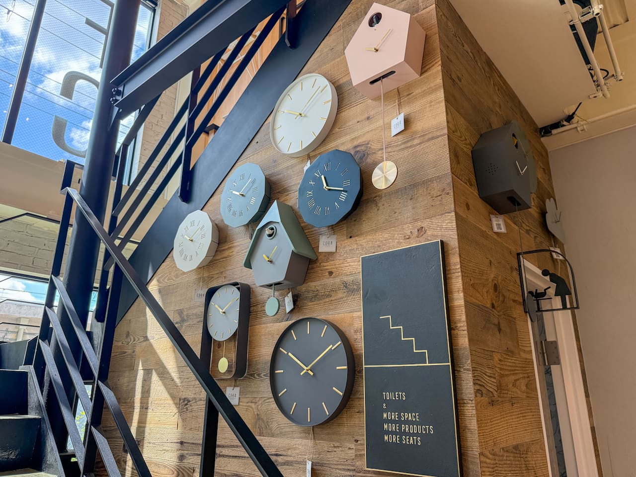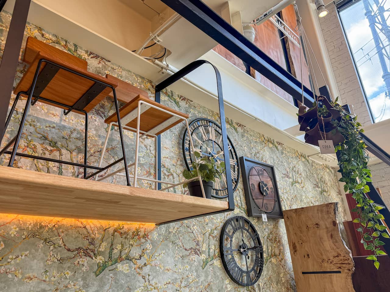 机や棚など店内を彩るインテリアのほとんどは友安製作所の職人によってつくられたもので、展示されている時計や椅子など、値札がついているものはすべて購入が可能だそう。
