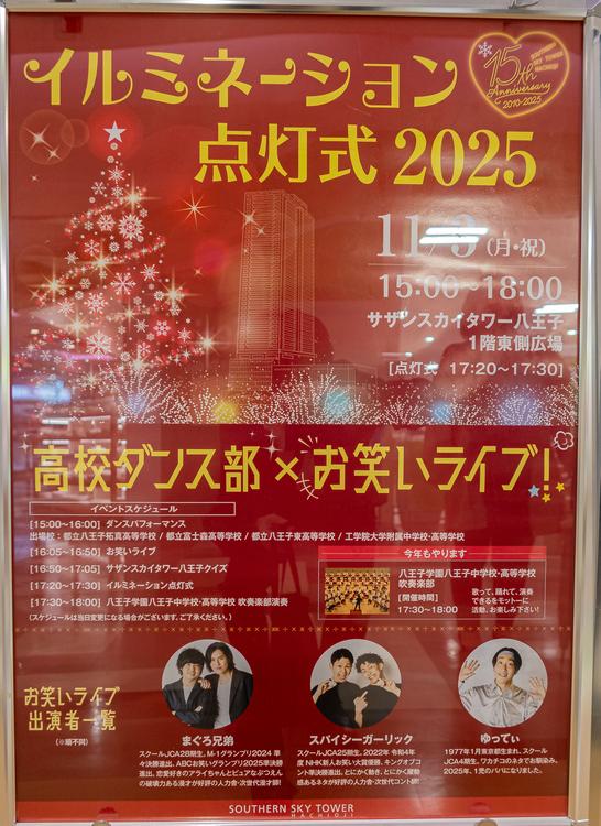 サザンスカイタワー八王子がきらめく季節に到来!2025年11月3日(月・祝)、『イルミネーション点灯式2025』が開催。高校ダンス部による華やかなパフォーマンスや、お笑いライブなど、点灯前から盛りだくさん!笑顔あふれる八王子の夜を一緒に楽しもう。