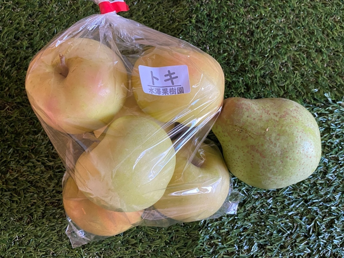 今回、購入したのは黄色いりんごの「とき」と昔ながらの梨の「千両梨」です。「とき」は6個で1,000円、千両梨は1個400円。