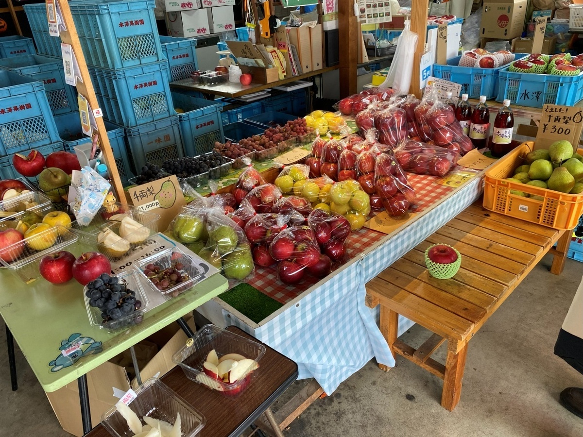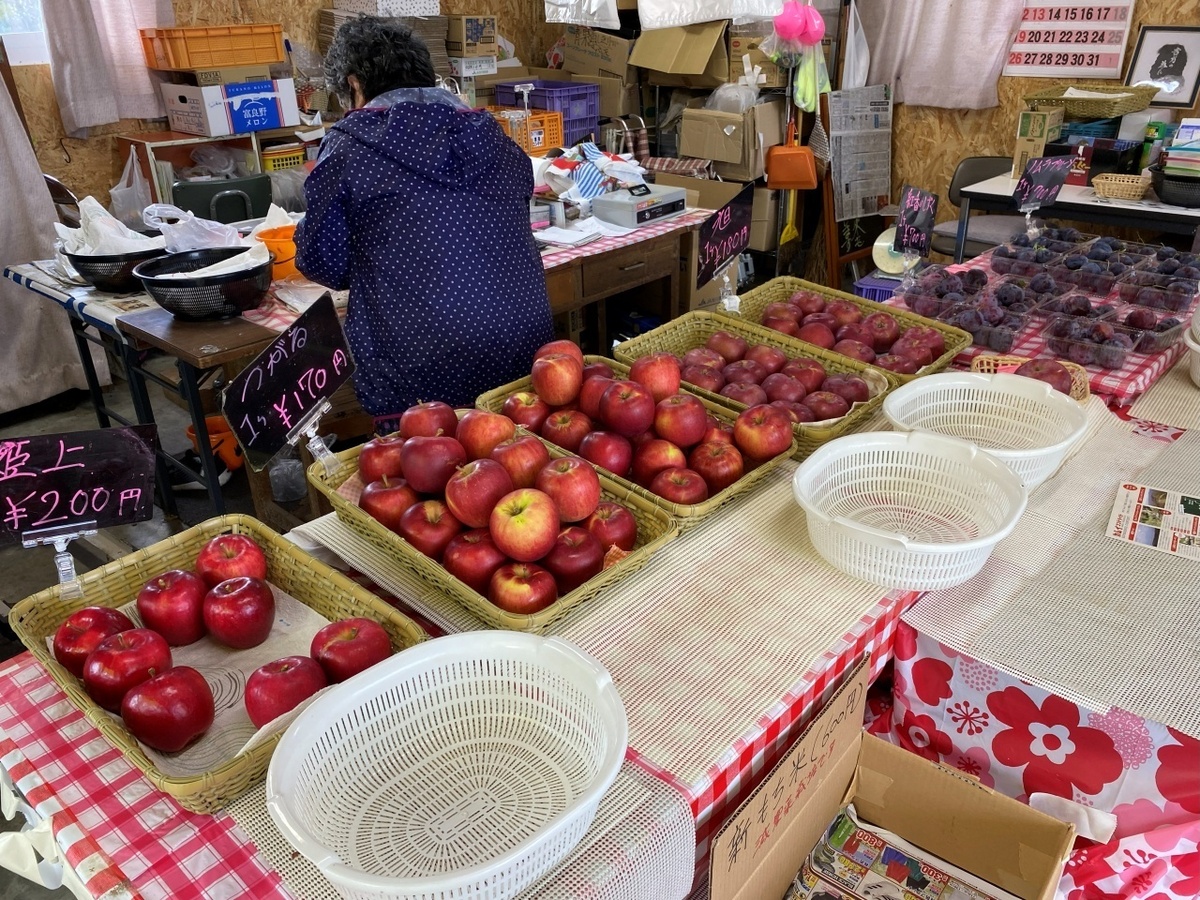 直売所には、「あかね」や「とき」「つがる」「ひめかみ」などのりんごの他、ぶどうや千両梨も並んでいました。