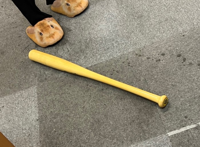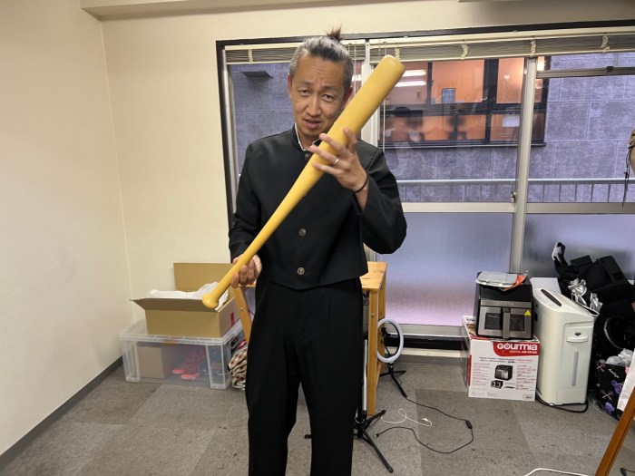 本人は「直進行軍 “風” 」と言っているからガチの直進行軍ではなさそうだが、だとしても心配すぎる。大丈夫かと思って見ていると、編集部にあったバットを手にしたP.K.サンジュン。