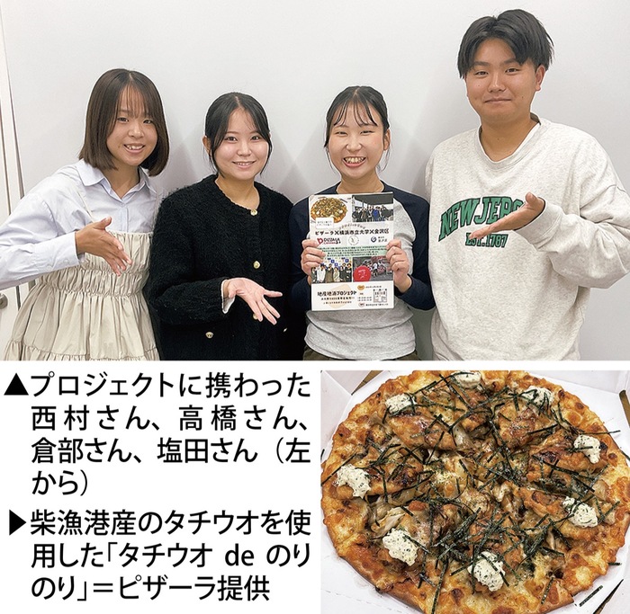 2月に他の2グループとともにピザーラに提案し、倉部さんらのグループの「タチウオdeのりのり」が採用された。8月に試食し「おいしさはもちろん、アイデアが実際に形になったことに感動した」と倉部さん。ふわふわした食感を生かすためにフリット状に加工されたタチウオと、ピザーラで人気の照り焼きソースがマッチし、老若男女が楽しめるピザが完成した。