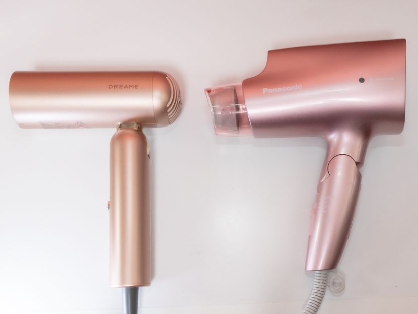 手持ちのドライヤーと並べてみるとこの通り、Pocket Uniがひとまわりコンパクトなことがわかります。(写真左:ポケットユニ、右:パナソニックのナノケアー※ノズルは取り外し可能)