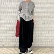 カーディガンのカラーを引き立てるために、バッグや靴はパンツと同色の黒を選ぶと◎
