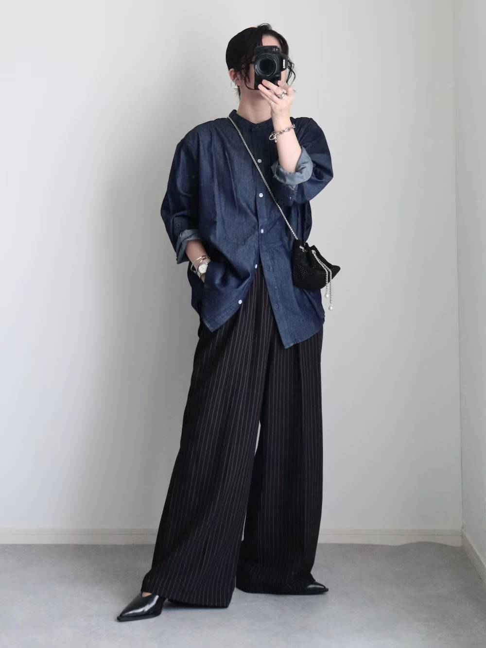 【初秋編】今っぽい黒パンツコーデ①デニムシャツ×ピンストライプ柄パンツ