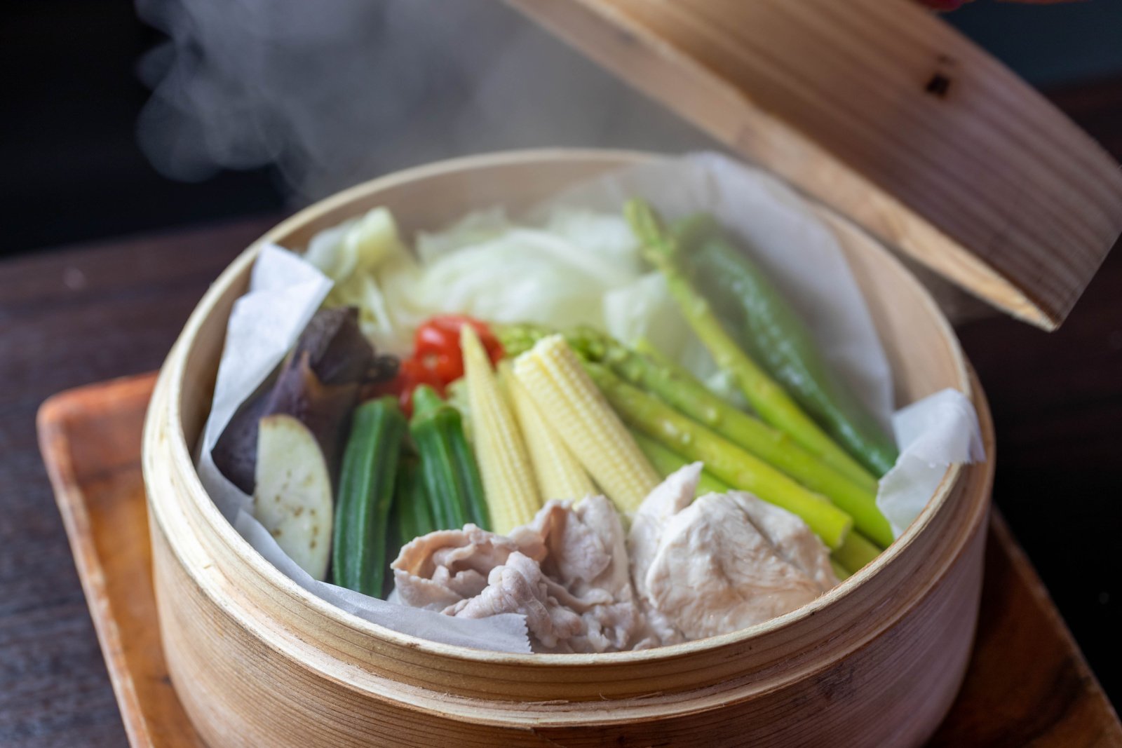 かぼちゃ、さつまいも、きのこ。秋ならではの食材をせいろで蒸すと、竹の香りと共に食材のふんわりとした香りが相まって食欲をそそる。