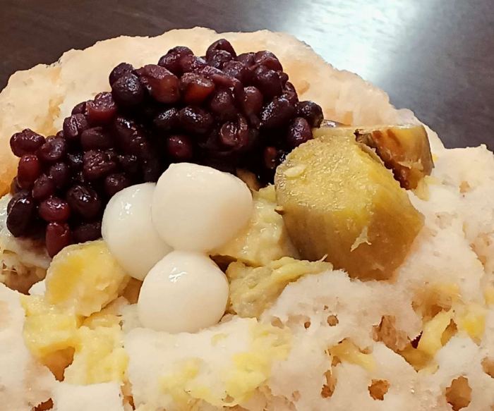 ふわふわの氷の上にはほうじ茶シロップと焼き芋シロップがたっぷりかけられています。さらに焼き芋、白玉団子、あんこと和のスイーツたちが勢揃い!