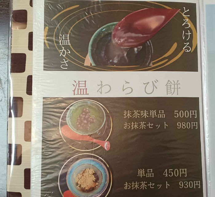 「いもあんみつ」や「きなこもち」、新食感が楽しめる「温わらび餅」など横田さんが手がけた魅力的な甘味が、メニューにはずらりと並んでいます。