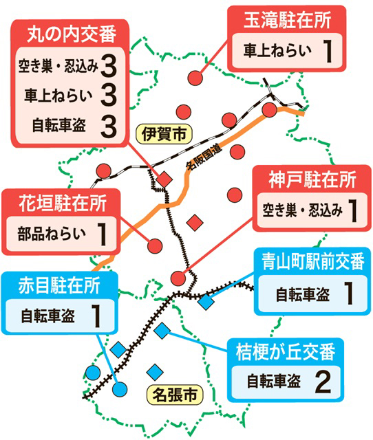 伊賀署では、空き巣や倉庫などを狙った侵入盗が4件(丸の内3、神戸1)発生。車上ねらい4件のうち3件は、10月30日に三田地内のアパート3か所で発生したもので、いずれも車のガラスが割られ、中にあったカバンなどが盗まれた。