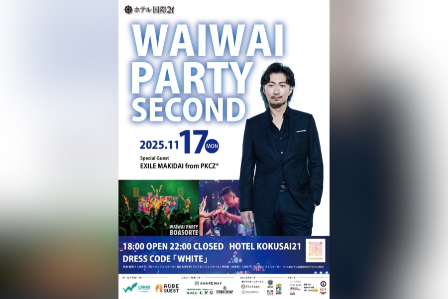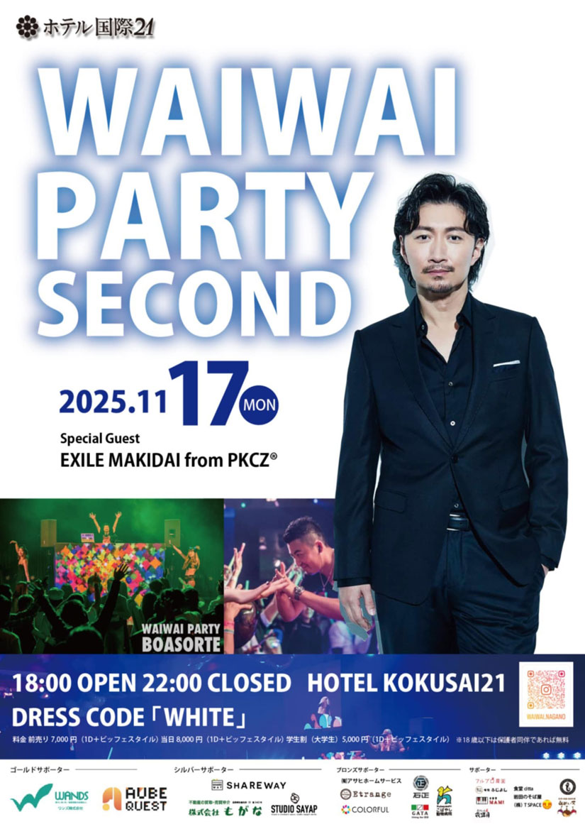 2025年11月17日(月)に長野県長野市にある「ホテル国際21」で『WAIWAI PARTY SECOND(ワイワイパーティー セカンド)』が7年ぶりに開催。音楽・美食・出逢いを融合させたナイトイベントで、スペシャルゲストとしてEXILE MAKIDAIさんが参戦。他にも長野県のクラブシーンを牽引する「ワイワイパーティークルー」、「カルフォルニアナイト」、「SpaceBass」から実力派DJ陣が集結。アーティスト「越 ちひろ」によるライブペイントや、モデルたちがランウェイを歩くスペシャルファッションショーも必見です。