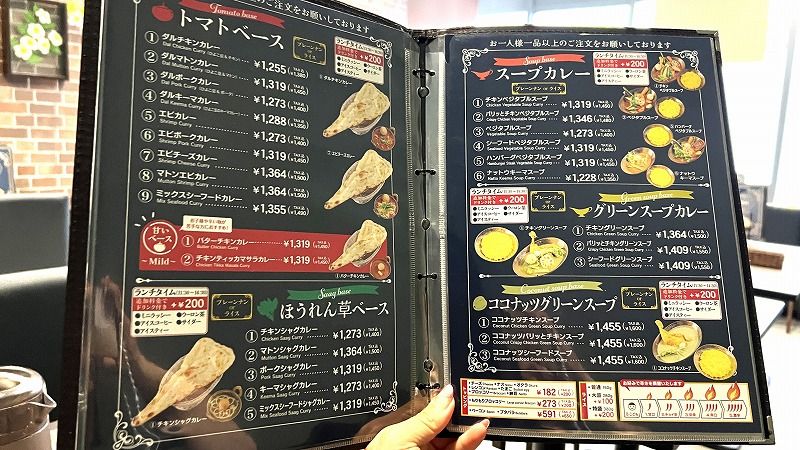 カレーは、玉ねぎベース、トマトベース、ほうれん草ベース、スープカレー、グリーンスープカレー、ココナッツグリーンスープ、といったメニューがずらりと並び、なにせ種類が多いので選ぶのに迷っちゃう!笑