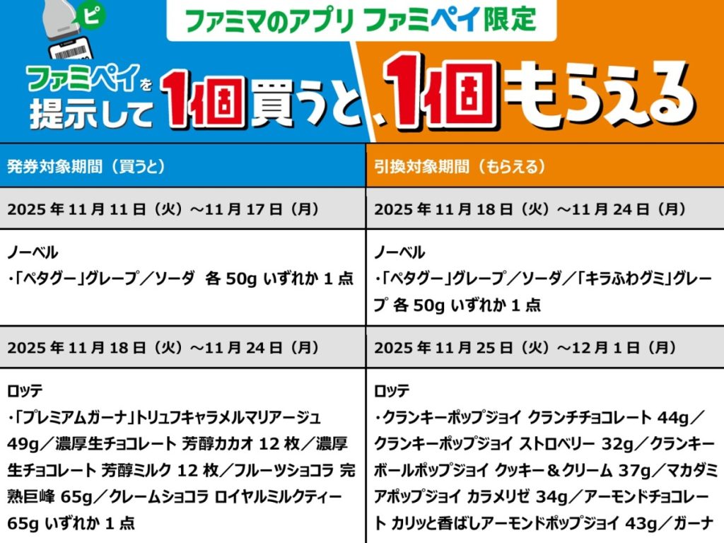 発券対象期間と引換対象期間が週ごとに設定されており、11月11日(火)~17日(月)ではノーベル「ペタグー」各種50gが対象、18日(火)~24日(月)期間ではロッテ「プレミアムガーナ」シリーズや濃厚生チョコレート等が対象となる。さらに11月25日(火)~12月1日(月)期間では同じくロッテの「のど飴」などが対象となる。