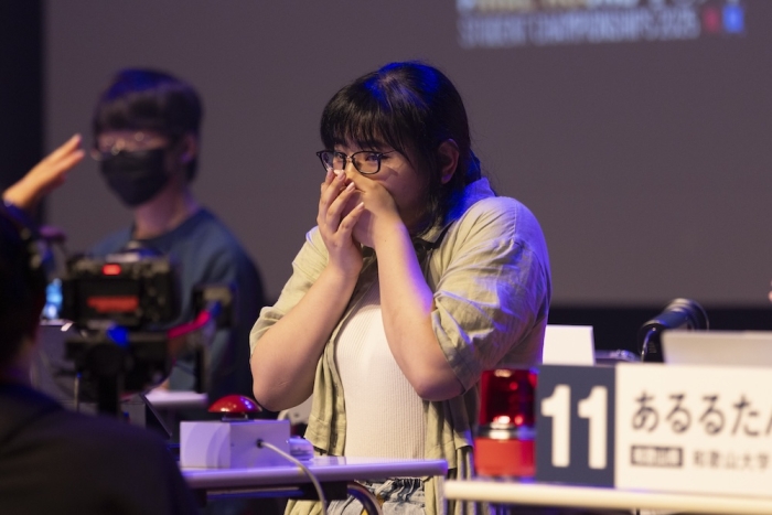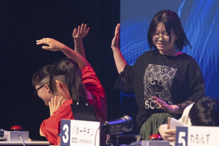その場の抽選で決定したお題は「メラメラ」×「未来」。MCのシャウトとともに一斉に12チームが手を動かし始める様子は圧巻だった。さあ一体誰が最初に、早押しボタンを押すのか……?