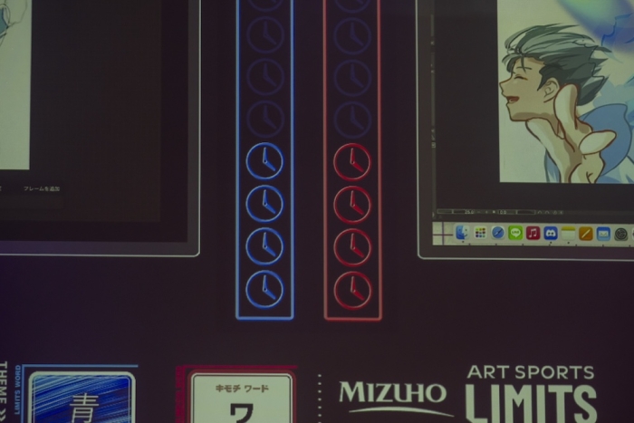 次の戦いまでの間に、ステージ上ではエキシビションとして「デジタルアートパフォーマンスショー」が開催された。元リミッツ選手であり、これまでの大会で解説を務めてきたプロのイラストレーター・クリエイターであるktymによる、お手本リミッツである。このあとの2回戦以降は完成作品だけでなく「制作過程」も審査対象となる。アイデア・テクニックに加え、制限時間を使ってどう魅せるか・演出するかという表現力が大きな意味を持ってくるのだ。ktymによるパフォーマンスはまさにその部分に特化しており、ギャラリーの反応を受けて変幻自在に画面を展開させていく姿には、実況席から「まるでDJのよう」、「あれは愉快犯ですよ(笑)!」と興奮気味の感想が飛んだ。