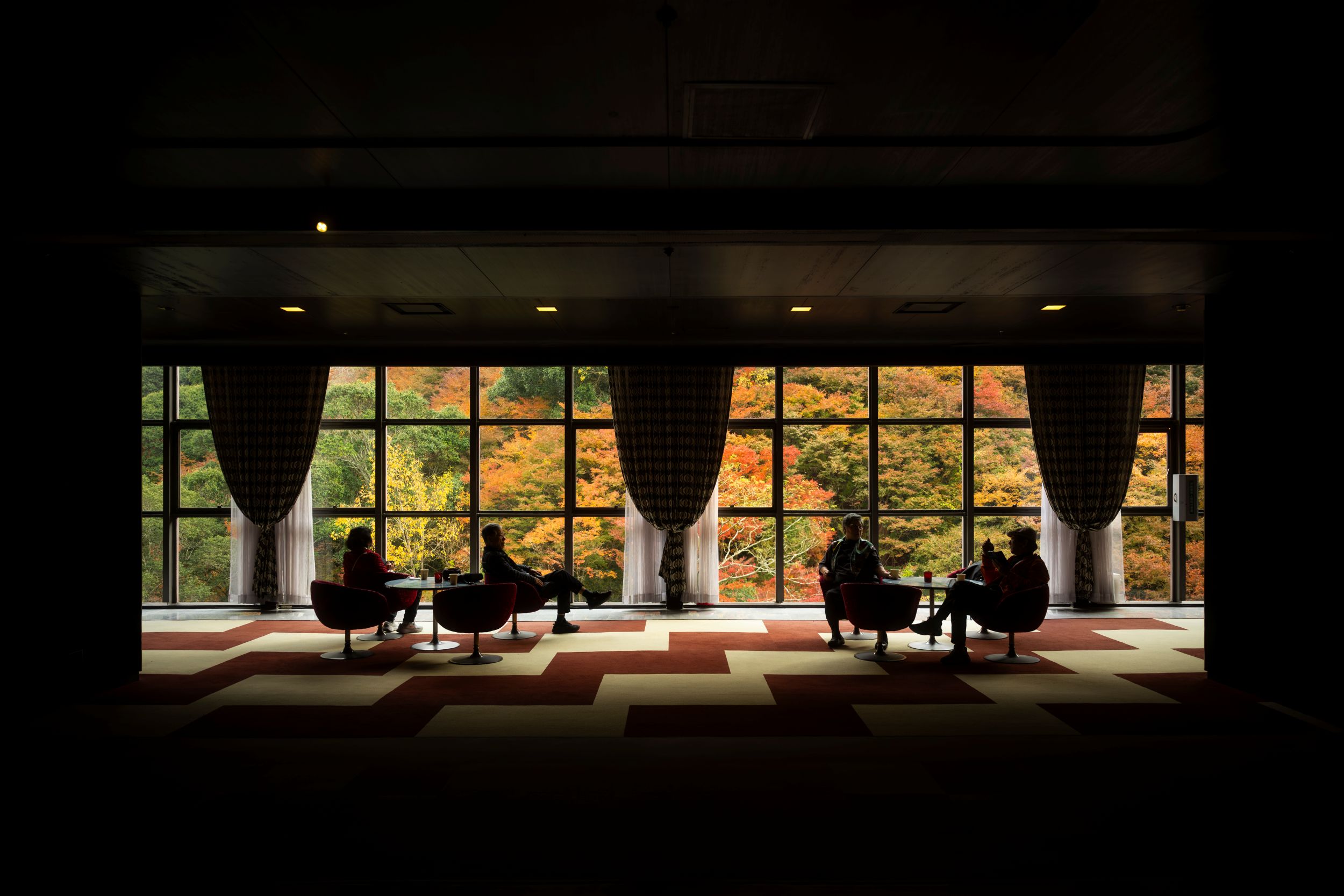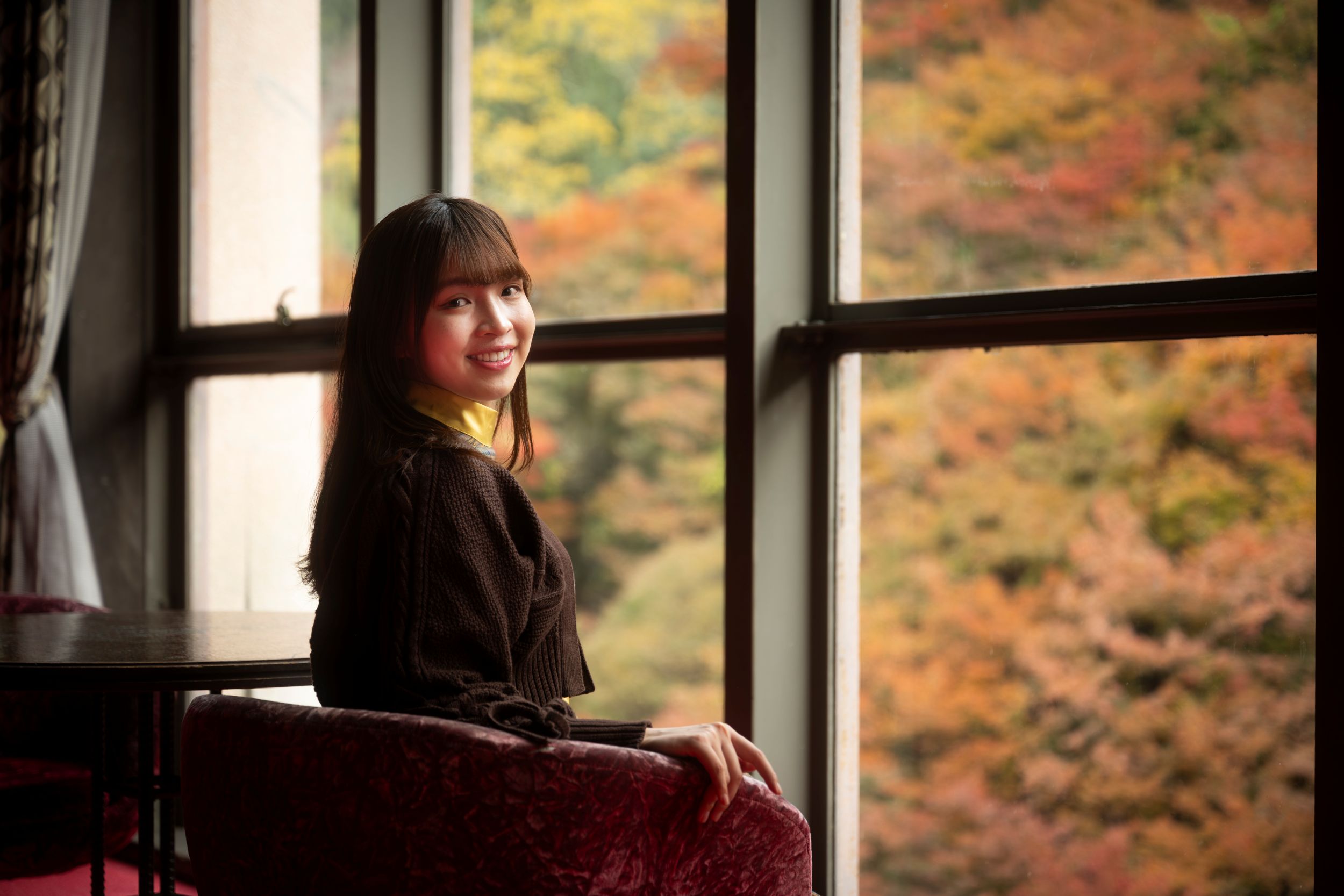 入館したらまずはフロントへ。奥に進むと広がる、紅葉を一望できるガラス張りのロビーが圧巻。昭和のレトロ建築の中にずらりと並ぶベロアの椅子とモダンなテーブルは、今ではなかなか出合えない“味のある”空間。この雰囲気が逆に新鮮と、若い人の来館も多いそう。入館は宿泊・温泉・食事利用者のみで、ロビーのみの利用は不可。