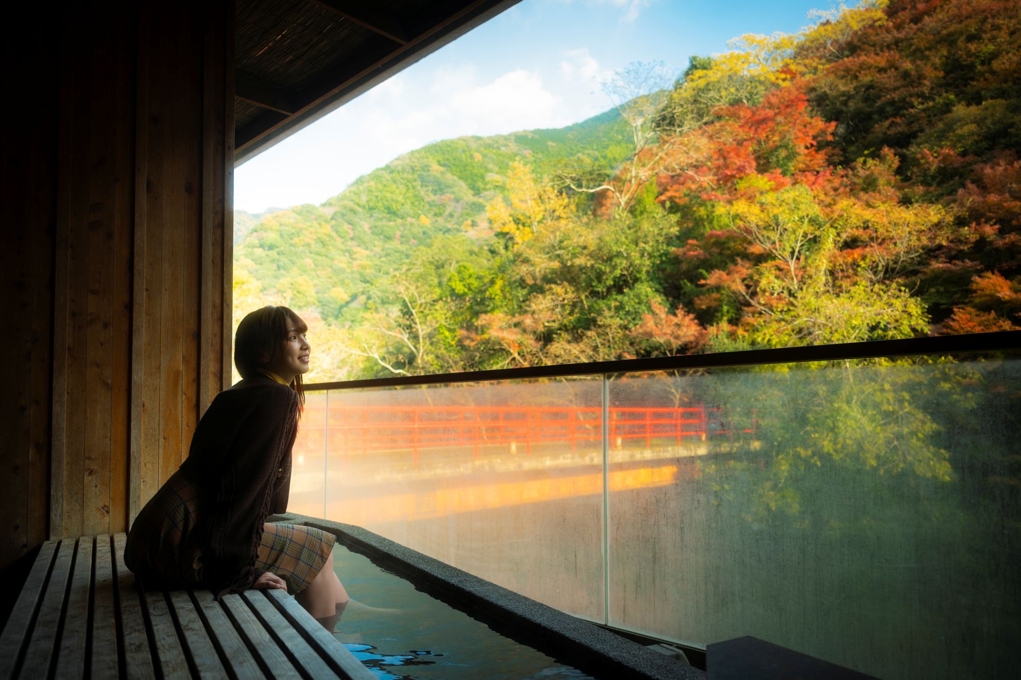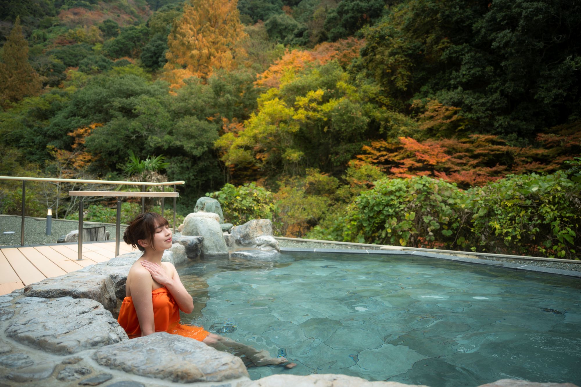松山市の中心地から車で30分ほどで行ける「奥道後 壱湯の守」は、露天風呂から大自然の絶景を眺められるゼイタク温泉。秋は紅葉が美しく、見逃せないシーズンだ。