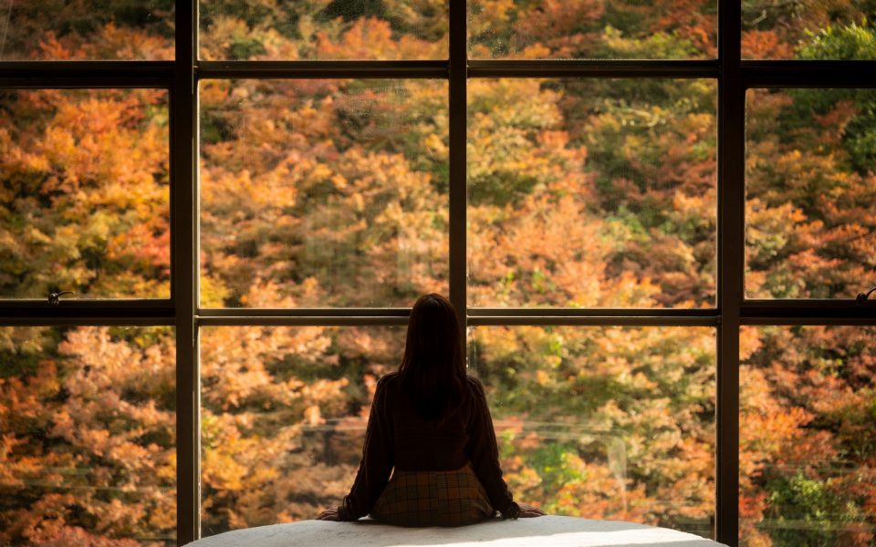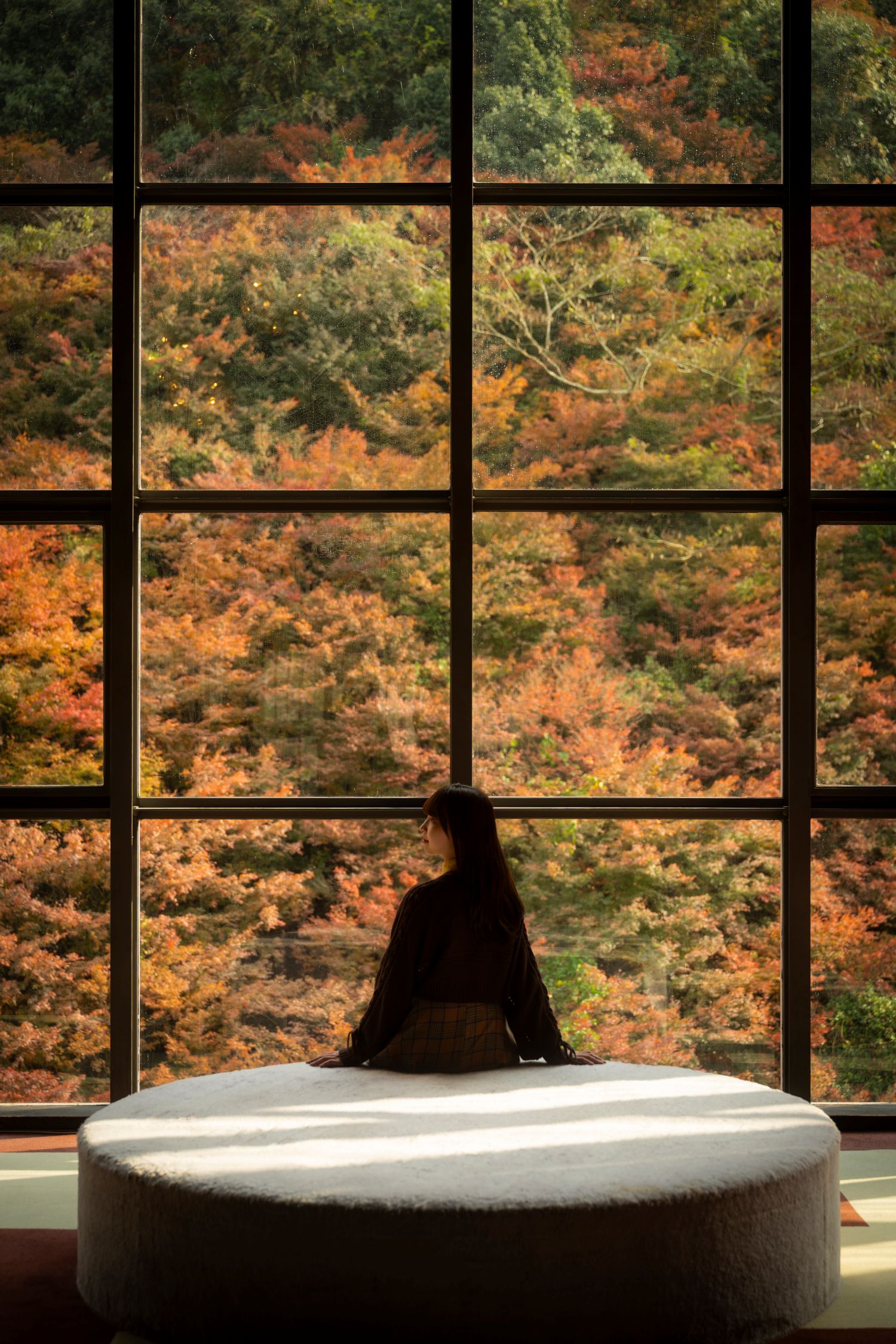撮影日は2025年11月26日で、まさに紅葉ピーク。山を近くに感じる壮観な景色に、お風呂までの移動中から思わず見惚れてしまう。しかもこの景色が入浴中も楽しめるというのが「奥道後 壱湯の守」の大きな魅力。さらに宿泊なしでも日帰り温泉を利用できるのがうれしいポイント。