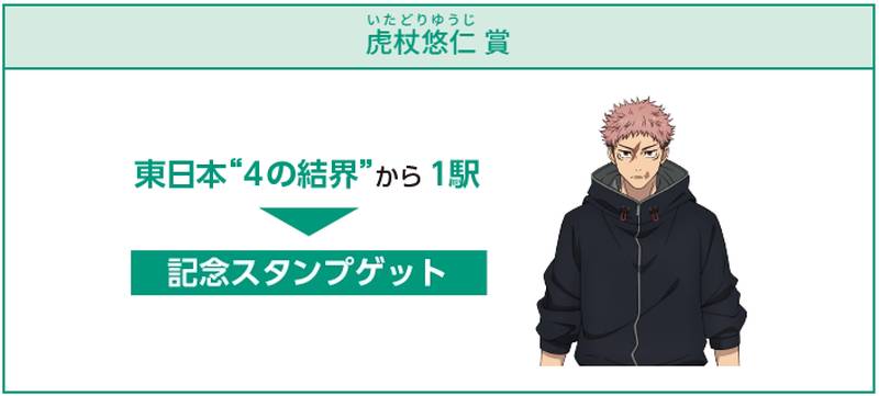 「エキタグ」アプリをダウンロードし、スタンプ帳を開いてエントリーのうえ、JR東日本管内の4つのエリア(以下、東日本“4結界”)の駅に設置されたスタンプを獲得すると、TV アニメ『呪術廻戦』第3期「死滅回游 前編」の場面カットを用いたスタンプやキャラクターの記念スタンプが手に入る。さらに“仙台・岩手・青森結界対象5駅限定”で掲出する限定オリジナルポスターや、虎杖悠仁役 声優 榎木淳弥のサイン入り「キャンペーンポスター」が抽選で3名に当たる。