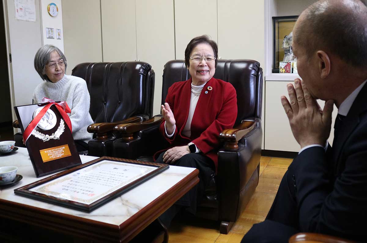 小佐野小への表彰伝達は11月26日、同校で行われた。釜石ユネスコ協会の岩切久仁会長、佐々木聡理事、岩間千枝子理事、高橋宏樹事務局長が訪問。岩切会長が松本校長に表彰状と盾を手渡した。松本校長は「子どもたちにとって、受賞は大きな励みになる」と感謝。全校朝会で報告する際に「受賞の意義をしっかり伝えたい。先輩たちが長い間続けてきた価値を知ることで、『自分たちも』と継続の意識が高まると思う。自己肯定感を得ることにもつながる」と話した。