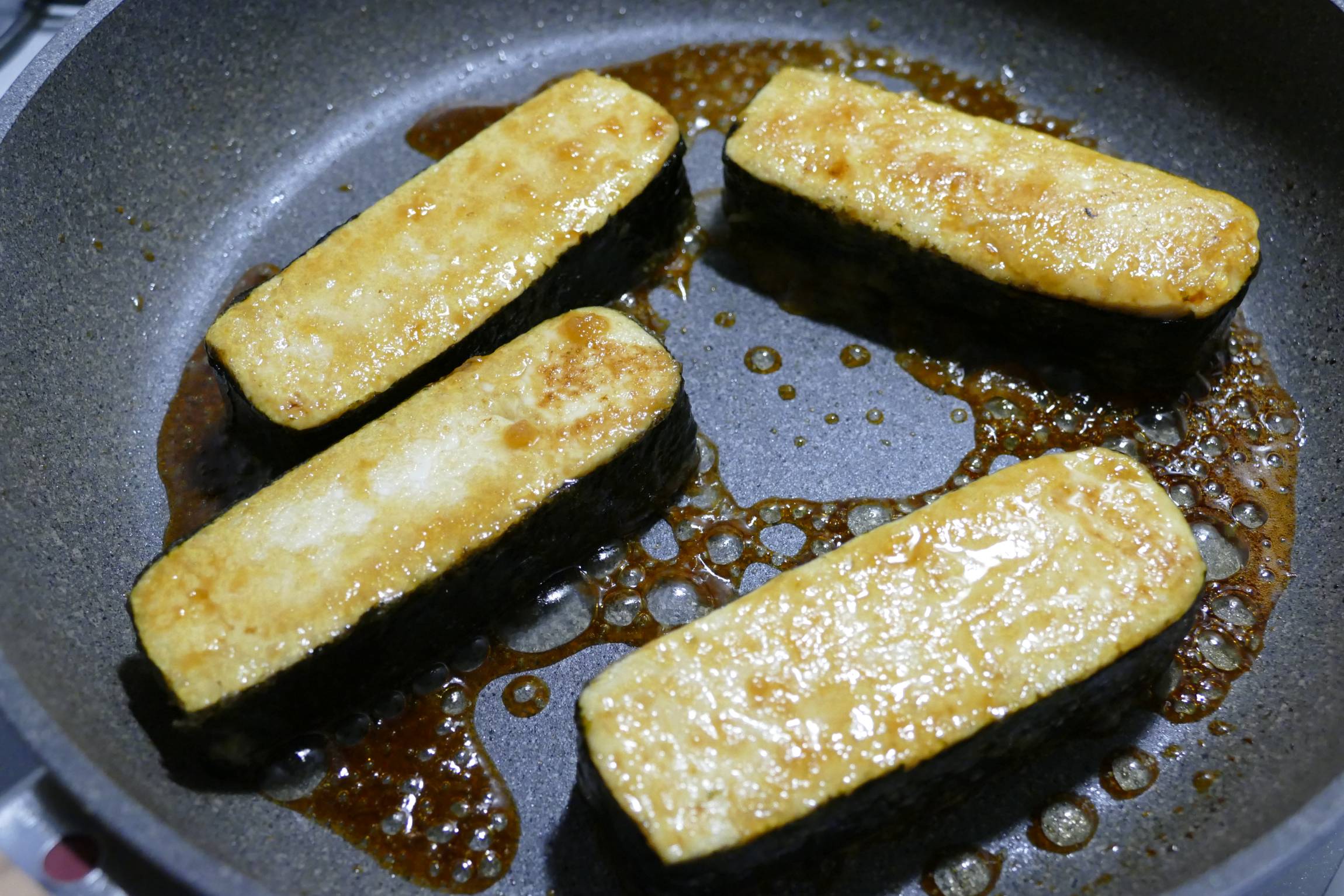 フライパンにサラダ油を入れて中火にかけ、間隔をあけて海苔巻き豆腐を並べて返しながら全面を焼き固めます。箸で表面を触ってみて、湿った感触がなくなれば十分です。