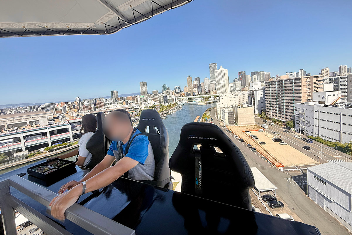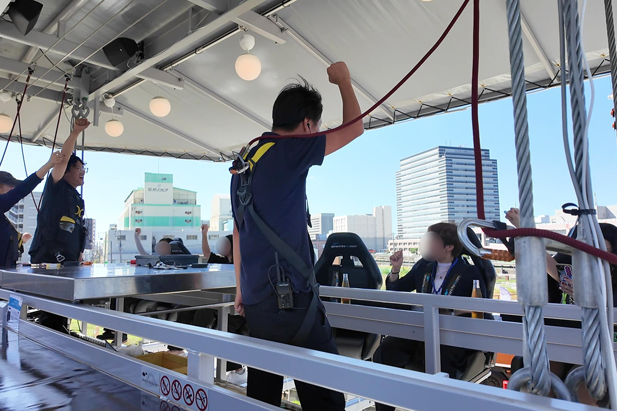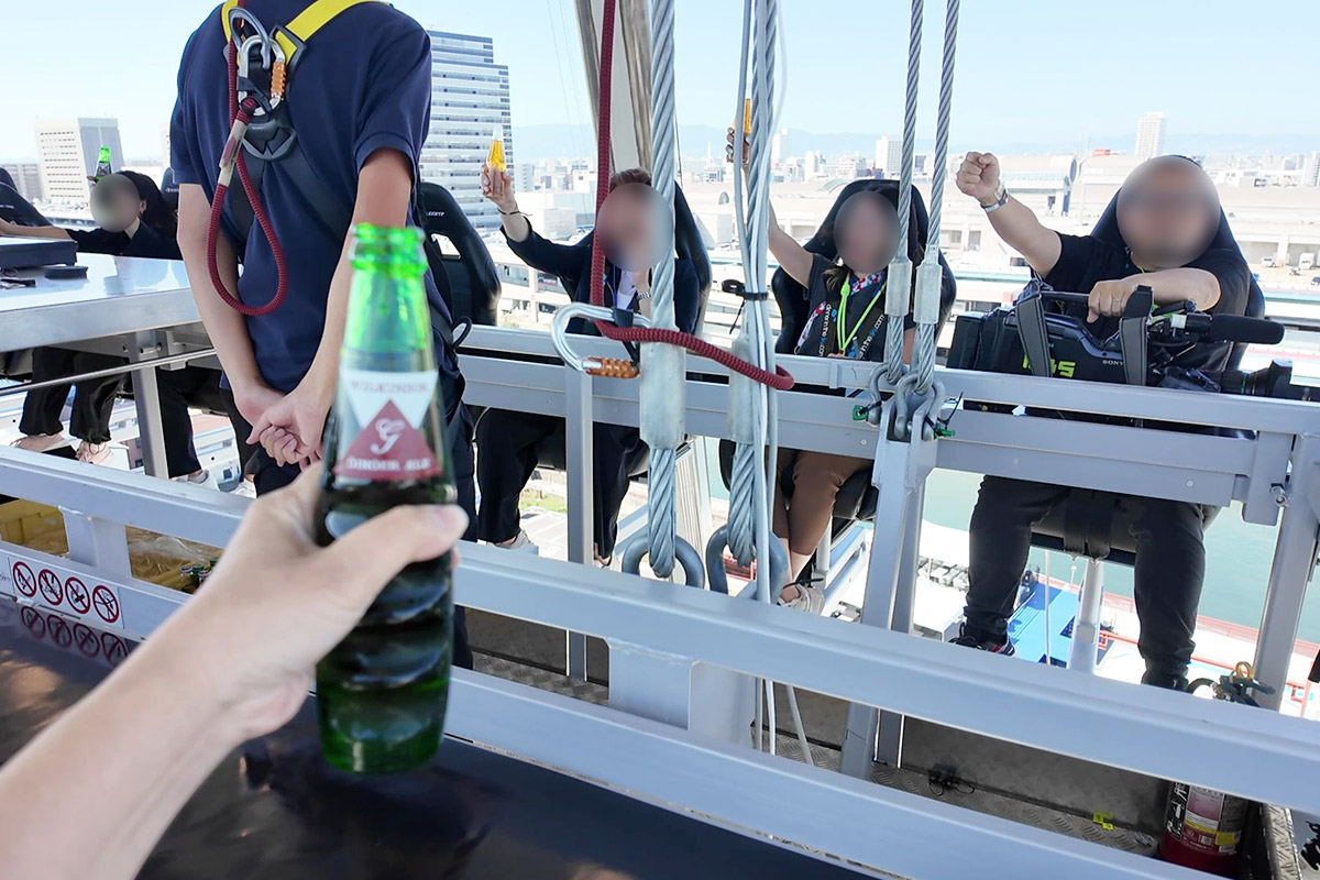 ついに到達した地上40メートル地点。乾杯のグラスが太陽の光を受けて輝き、眼下には中之島を中心とした大阪の街並みが広がります。ビル群の間を縫う川面が反射する光、青空とのコントラストそのすべてが、まるで一枚の絵のようでした。