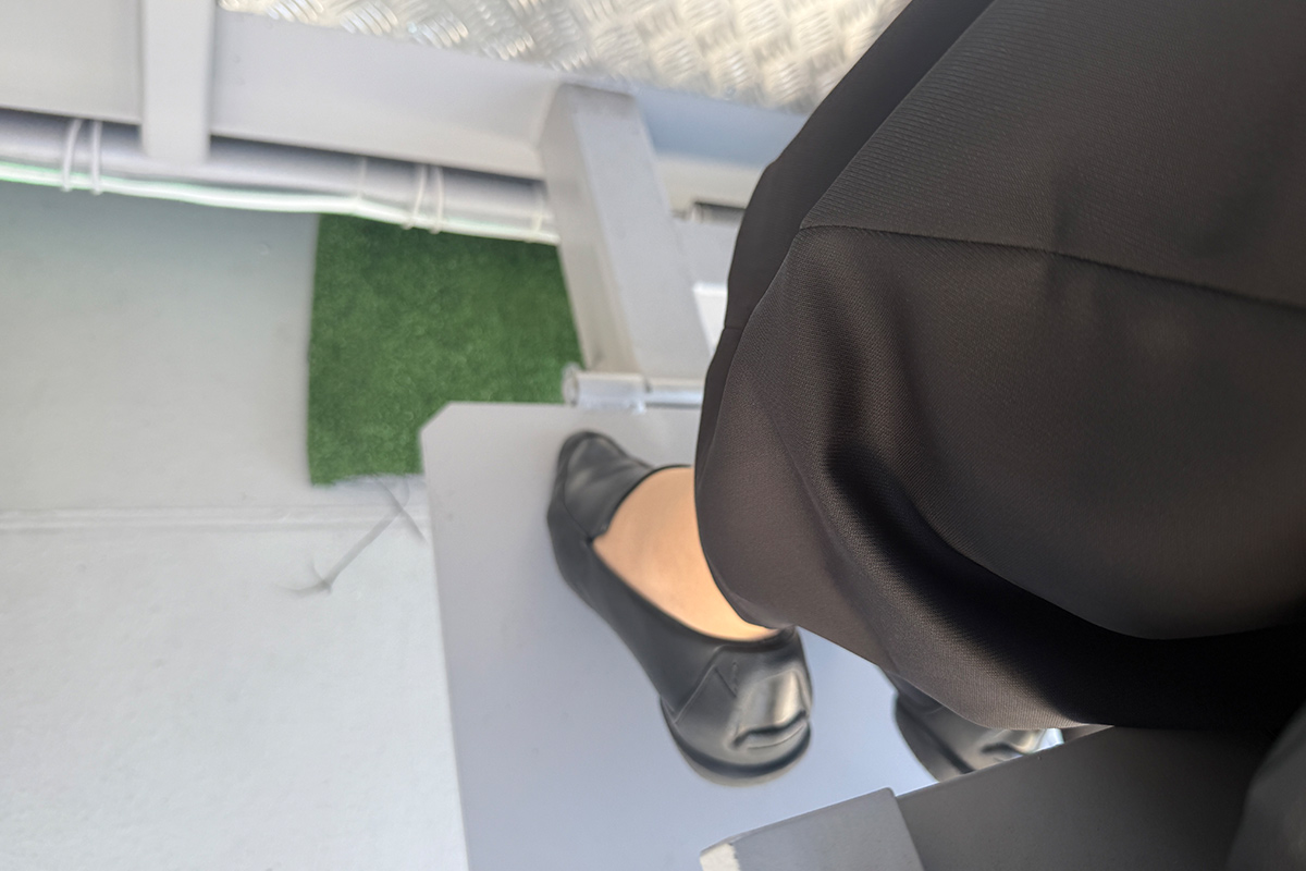 足元は薄い天板に軽く乗せるだけ。少しシートが高めに設計されているため、筆者(身長166cm)はギリギリ届く程度。小柄な方は宙に浮いたような感覚になるかもしれません。