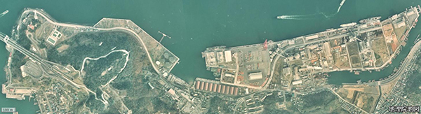 1970年代の現役当時の航空写真。田ノ浦港の端まで線路が続いていたことがわかる。引用元:国土地理院撮影の空中写真(1975年撮影)
