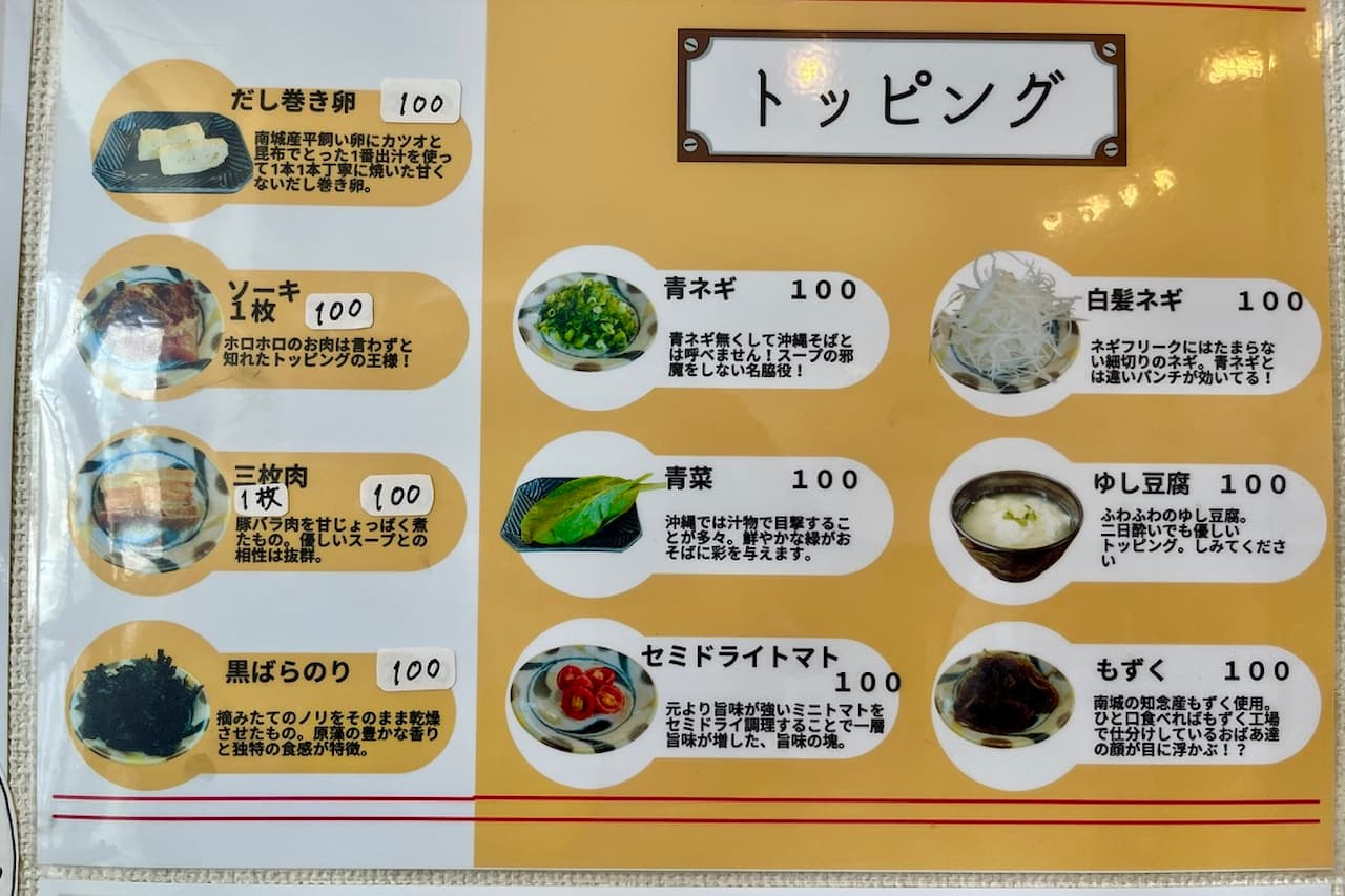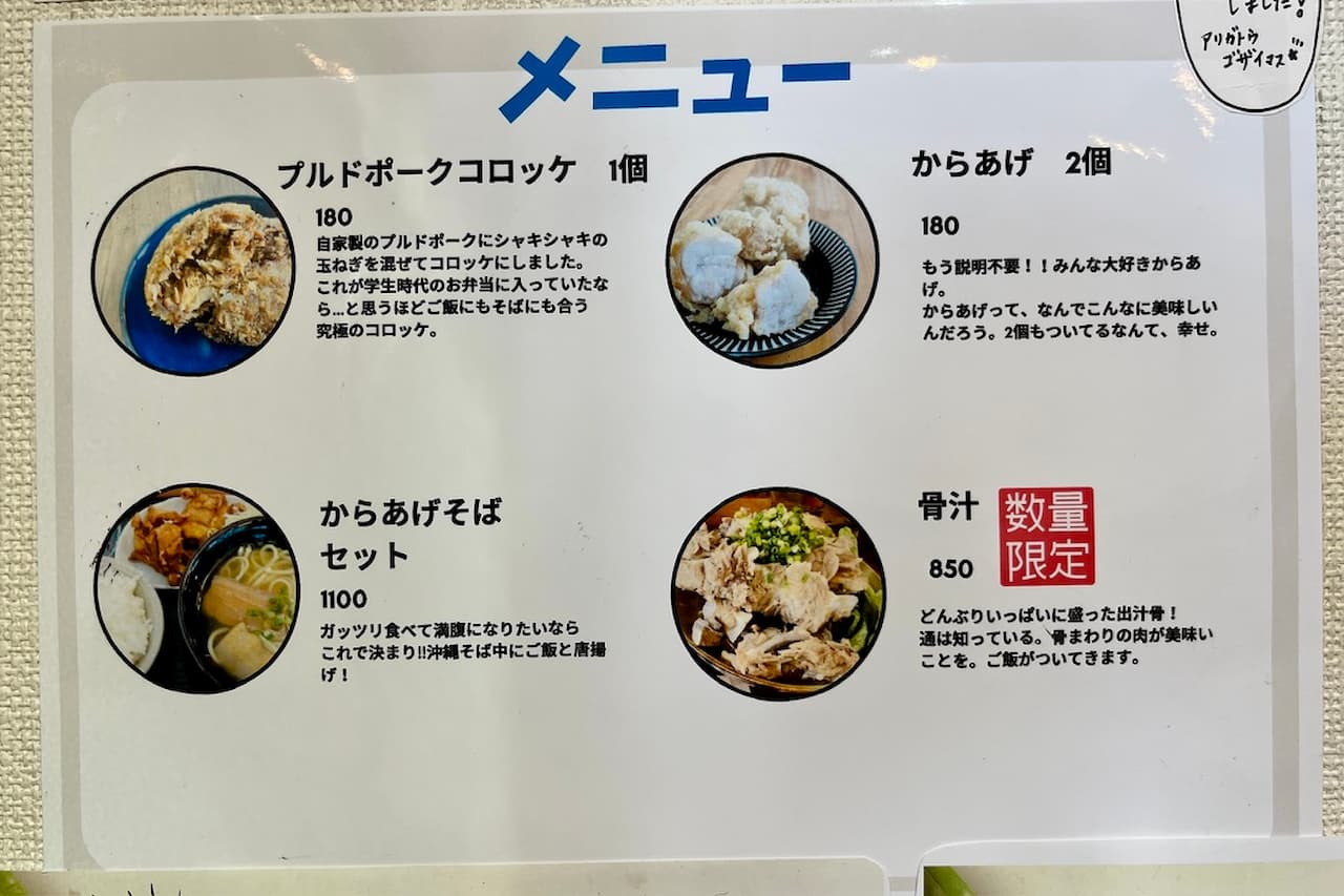 なかでも注目は、月替わりで登場する「スペシャルそば」。これが毎月ユニークで、「本当にこれも沖縄そば?」と驚かされるような創作メニューがならびます。 取材した7月は、台湾のパーコー飯をアレンジした「パーコーそば」が登場していました。過去には「ホタテバターそば」や「坦々沖縄そば」、「えびのジェノベーゼそば」などジャンルにとらわれないアイデアが光るそばが登場しています。 和・洋・中の要素が感じられるのは、オーナーが長年、日本料理とイタリアンの料理人として腕をふるってきたこと、さらに元・中華料理人のスタッフのアイデアも取り入れているからだそうです。 「アイデアは旬の食材やそのときのひらめきから」と語るオーナー。既存の枠にとらわれない、自由な発想から生まれるメニューは、常連客の間でも楽しみにしている方が多いのだとか。 人気メニューはお昼頃には売り切れてしまうこともあるので、狙っている方は早めの来店がおすすめです。