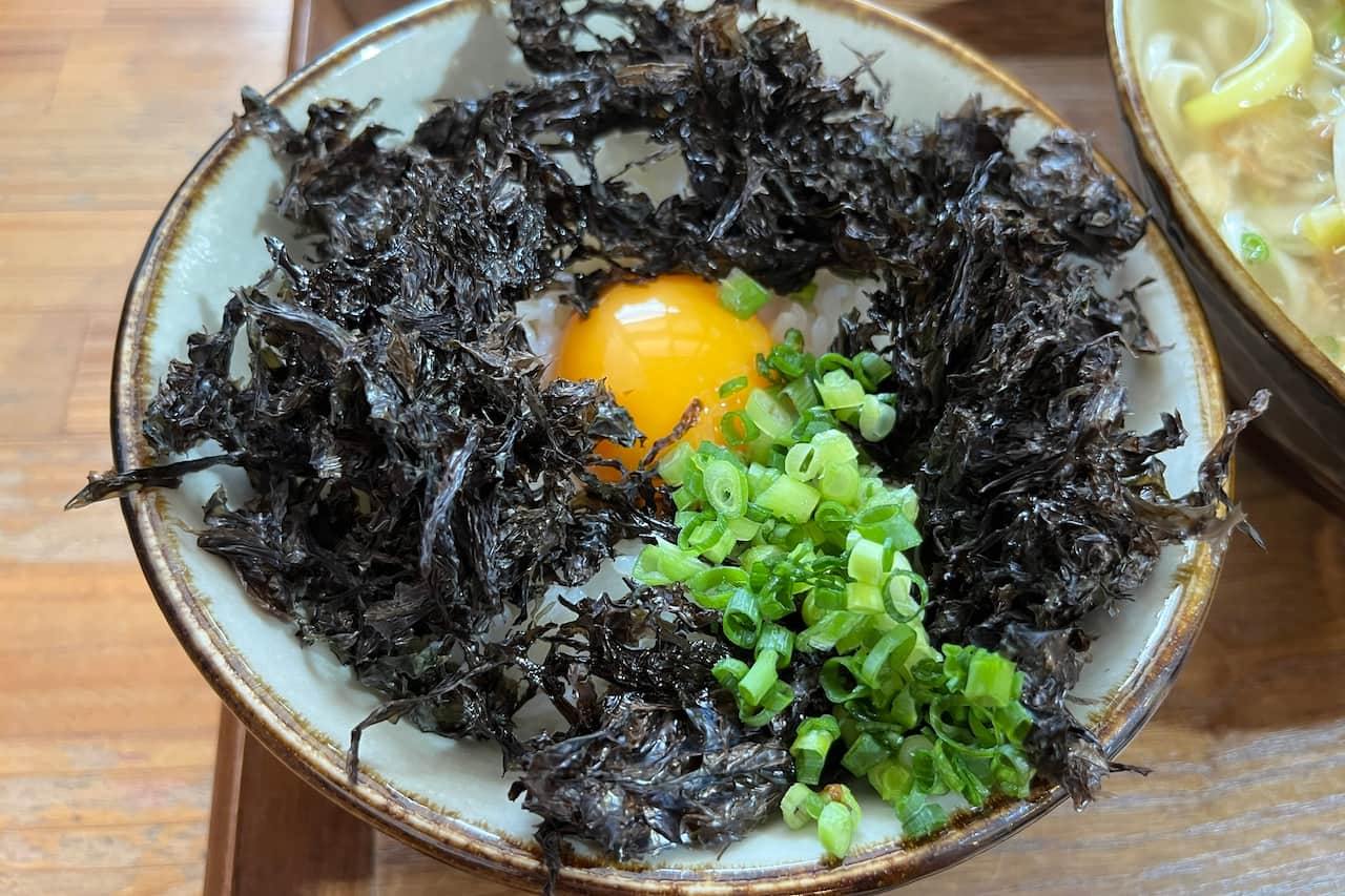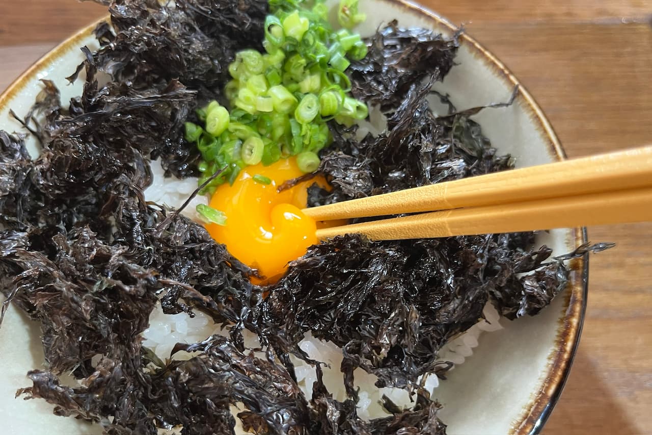 まずは王道の食べ方で、しょうゆをかけて卵黄をつぶし、かき混ぜてひと口。この卵黄に箸を入れる瞬間、たまりませんよね。 摘みたてののりをそのまま乾燥させたという黒バラのりは、成形前ならではのしっとり感としっかりした噛みごたえがあり、磯の香りがふわっと広がります。 濃厚でまろやかな卵黄が、のりやごはんと絶妙に絡み合い、青ネギの薬味が全体をさわやかに引き締めます。日常的な食材の組み合わせながら、これほど完成度の高いTKG(たまごかけごはん)はなかなか出会えません。