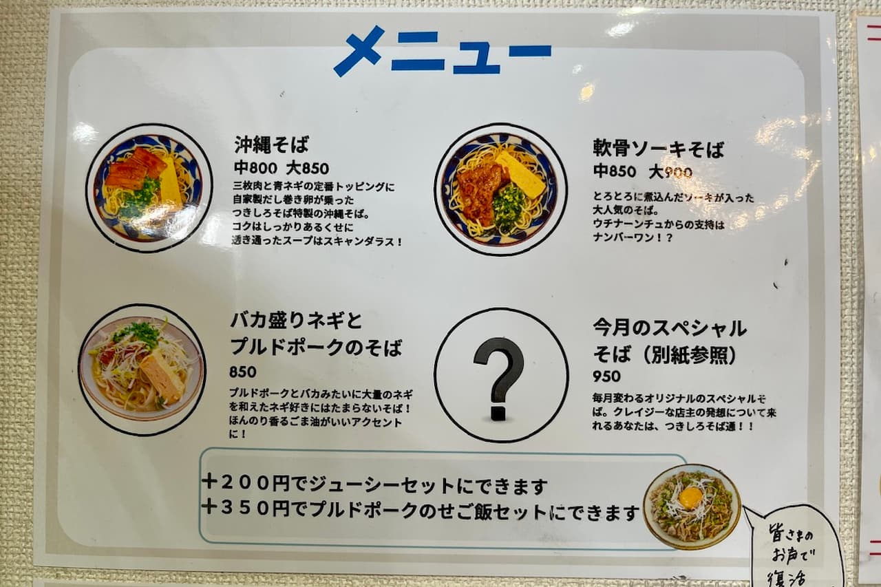 「つきしろそば」の魅力のひとつは、メニューの豊富さです。 定番の沖縄そばやソーキそばはもちろん、他店では味わえない個性的なそばがそろっていて、何を注文しようか迷ってしまうほど。
