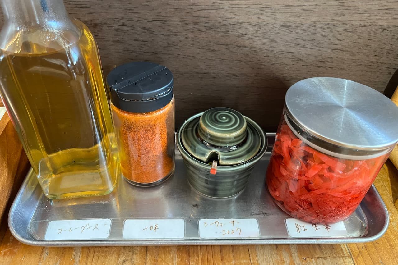 テーブルに置かれていた薬味をみると、定番のコーレーグースや一味、紅生姜などがならぶなか、特に気になったのが「シークヮーサーこしょう」。こちらはオーナーの手作りなのだそう。