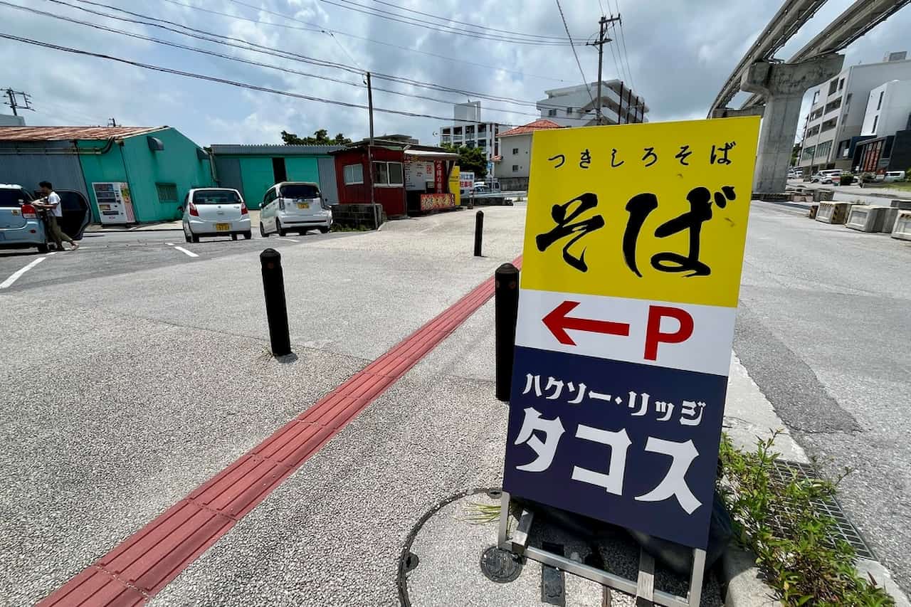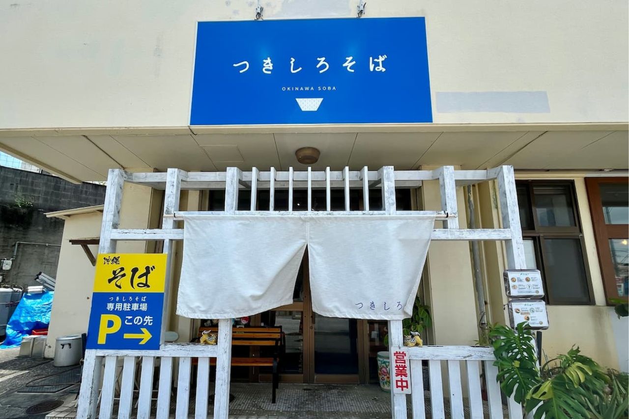 駐車場から少し歩くと、青い看板と白いのれんが目印の「つきしろそば」が見えてきました。 「つきしろそば」はもともと南城市にあったお店で、2023年4月に現在の浦添市前田へ移転したそうです。通り沿いにあるので、はじめてでも迷わずたどり着けるわかりやすい場所にありました。 モノレール「前田駅」からも徒歩1分ほどと、車がなくてもアクセスしやすい立地です。