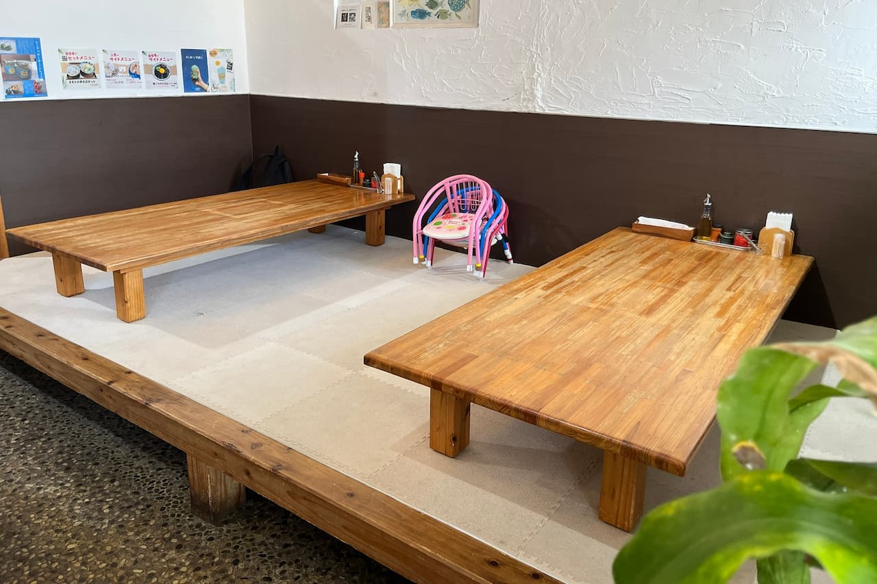 店内は、座敷席が2つ、テーブル席が3つ、カウンター席が4席とコンパクトですが、落ち着いた雰囲気で居心地のいい空間が広がっています。 子ども用のいすもあり、小さな子どもを連れた家族でも利用しやすいと感じました。