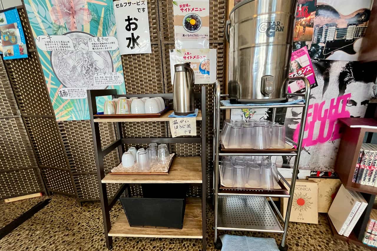 セルフサービスのお水に加えて、温かいほうじ茶が用意されていたのも個人的にはうれしいポイント。 冷たい飲みものが苦手な人や、ホッとひと息つきたいときに助かります。
