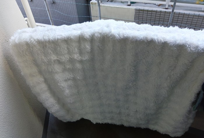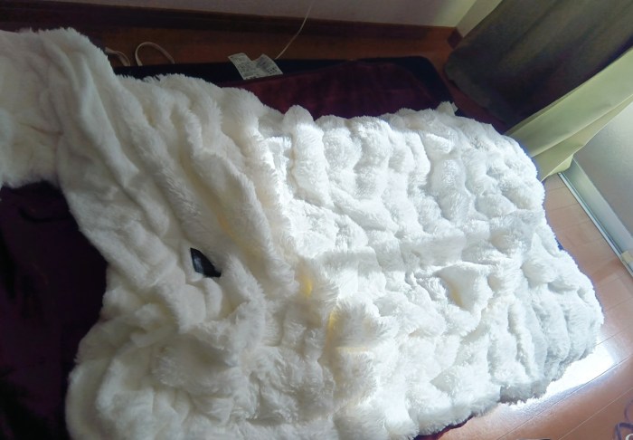サモエドは最高だし、裏側のミンクファーも密度の高い短い毛が柔らかくサラサラしてて、こちらはさながら高級ぬいぐるみみたいな肌触り。どちらもゴワッとした感じが皆無で、毛布として初めての感触である。肌触りの良さは確かに。ただ、ファーストインパクトはもう1つあって……