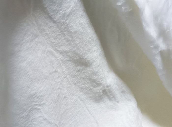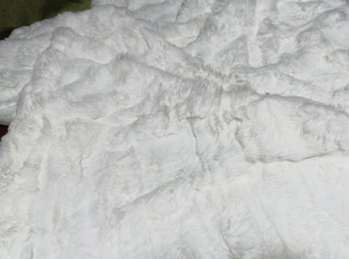 開けてみると、思ったより毛が長かった。商品ページにはラビットファー調の生地とミンクファー調の生地で両面使用可能と書かれていて、画像を見るとラビットファー側の生地が綿みたいなニュアンスに見えたけど、実物はすべすべふさふさの毛でもふもふしているニュアンス。サモエドみたいだ。