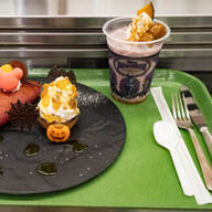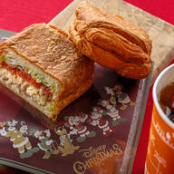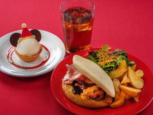 「プラザパビリオン・レストラン」では、ローストビーフとチキンが贅沢に入ったホットサンドが楽しめるスペシャルホットサンドセット(2,180円)や、魚介のうまみがぎゅっとつまったシーフードのトマトクリームソースにエビフライを添えたスペシャルパスタセット(2,180円)を提供します。どちらのセットにも、サンタクロースの帽子をかぶったミッキーをイメージした、濃厚なチョコレートとバニラムースのタルトが付いてきます。