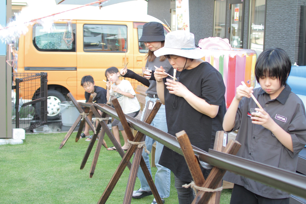 青空の下、家族や友人たちとレーンに流れるそうめんを夢中でキャッチ。