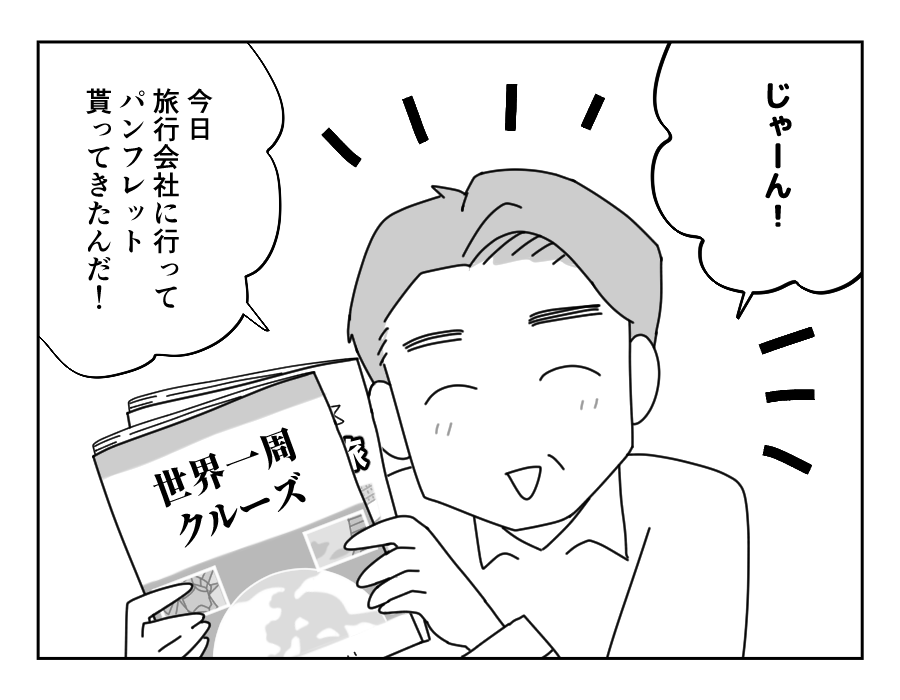 【編集部コメント】 ユウタさんはホクホク顔でクミコさんに世界一周旅行を提案します。世界一周旅行なんて、相当金銭的に余裕がないと行けません。フリーランスで働くユウタさんが、それくらい多くの仕事を頑張ってきたという証拠ですね。旅行好きな人だったら心躍る提案のはずですが、アレ? 意外にもクミコさんの反応はいまいち。もしかして、旅行が好きじゃなかったのかも……? いや~……長年連れ添った夫婦であるはずなのに、そんなことってありますか……?