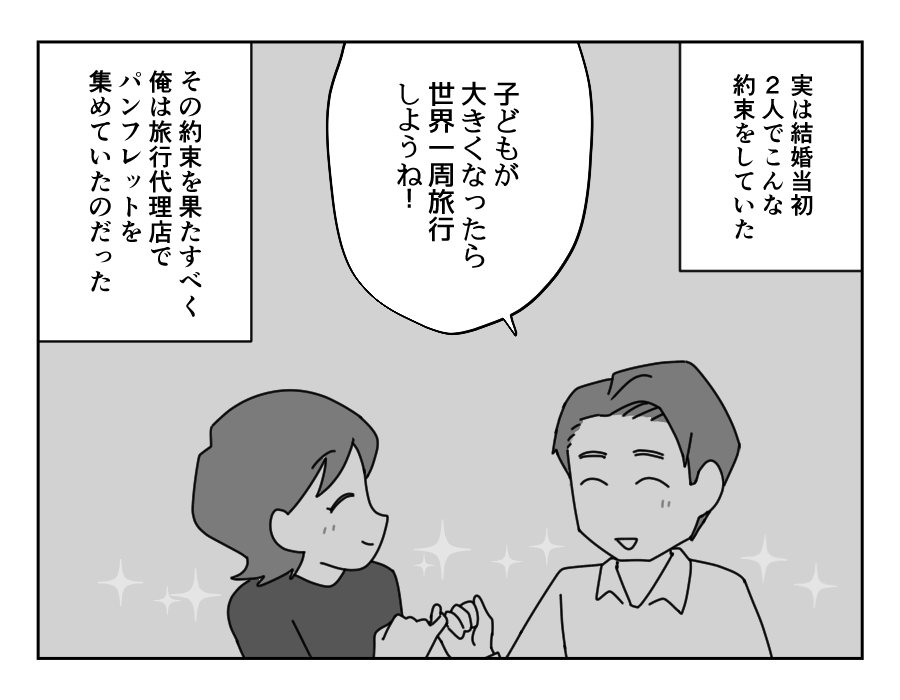 【編集部コメント】 そう、ユウタさんとクミコさん夫婦は、子育てが落ち着いたら2人で世界一周旅行をしようねと約束をしていたのでした。これからはじまる子育ての大変さをお互い認識していたからこそ、遠い先にご褒美を置いておくことで「それまで頑張ろうね」と自分たちを励ましていたのでしょう。