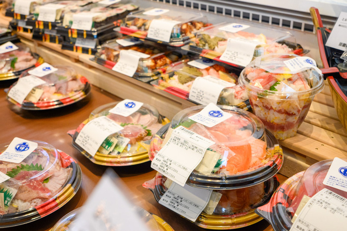 店内には、マグロやサーモンをはじめ、新鮮で旬の魚介類をふんだんに使った海鮮丼や海鮮巻き、握り寿司、刺身盛り合わせがバリエーション豊富に並びます。