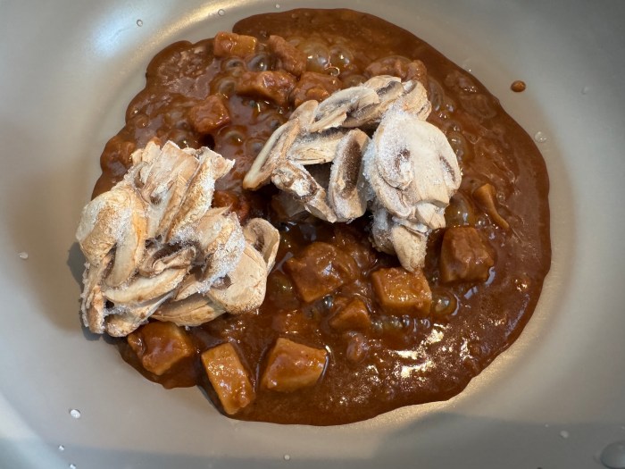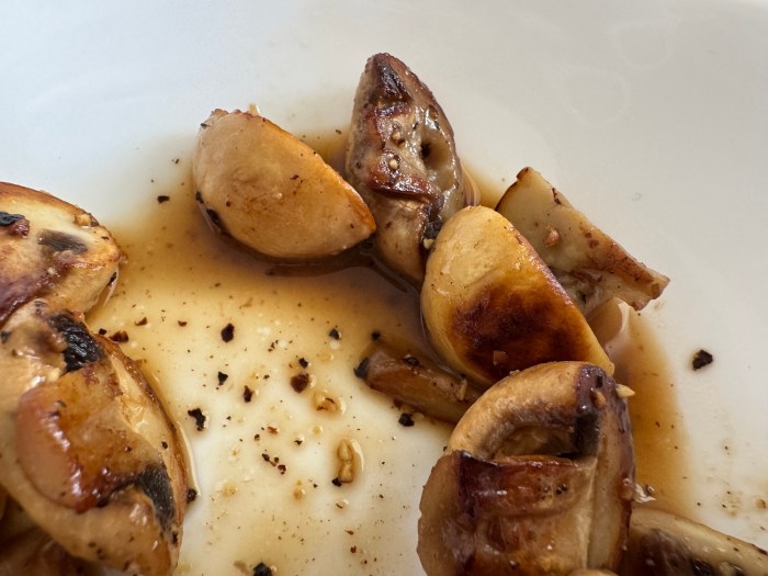 なおマッシュルームは加熱するとすぐに水分(うまみ汁)を放出し始める。バターも徐々に固まり始めるので、この料理のポイントは “なるべく早く食べること” だ。覚えておこう!